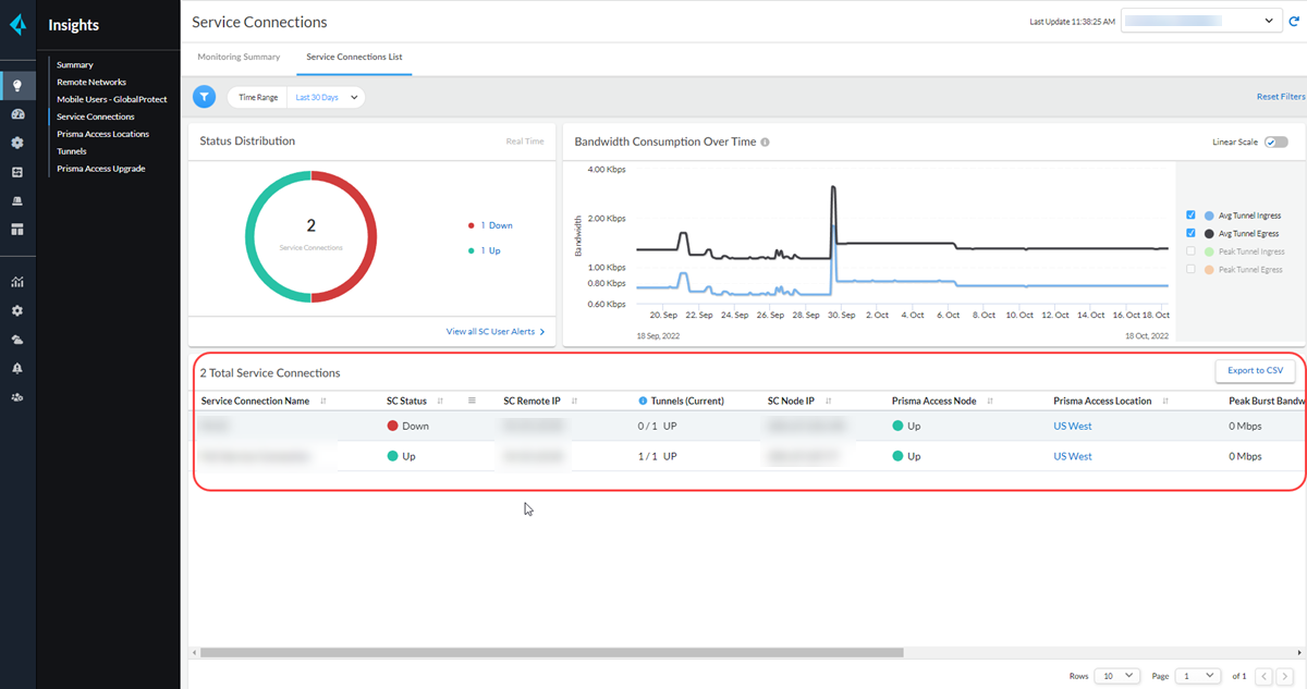 You can view service connections status and metrics in the Total Service Connections table using the sc_list resource.