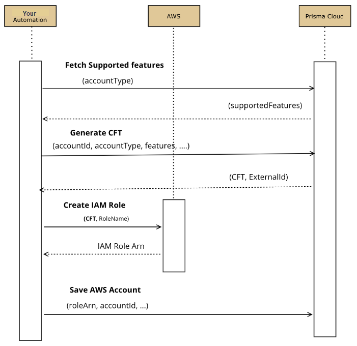 Invoke the Add AWS Cloud Account with the IAM Role ARN created in the previous step, required features state, and other payload.
